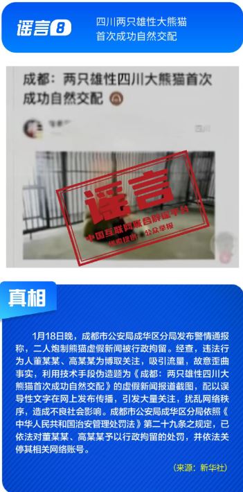 ??針對各類網(wǎng)絡(luò)謠言與亂象,多部門開展協(xié)同治理,聯(lián)動整治。1月16日,中央網(wǎng)信辦召開全國網(wǎng)絡(luò)辟謠聯(lián)動機制第三次全體會議,部署以辟謠工作新成效助力清朗網(wǎng)絡(luò)空間建設(shè)。中央網(wǎng)信辦聯(lián)合工業(yè)和信息化部等部門持續(xù)整治汽車行業(yè)網(wǎng)絡(luò)亂象,處置一批涉嫌挑動對立、炒作負(fù)面話題、違規(guī)測評的賬號;國家廣播電視總局開展“AI魔改”視頻專項治理,各平臺處置大量違規(guī)內(nèi)容。各地網(wǎng)信部門積極行動,陜西西安深入開展房地產(chǎn)領(lǐng)域網(wǎng)絡(luò)專項行動,處置散布樓市謠言的房產(chǎn)中介賬號,四川成都依法處置30余個惡意關(guān)聯(lián)地域、污名化城市的違規(guī)賬號。公安機關(guān)依法打擊造謠傳謠人員。擺拍“小女孩在學(xué)校跳蚤市場用50元淘到名酒”、利用AI偽造“假救護車非法轉(zhuǎn)運”、編造“兩只雄性四川大熊貓首次成功自然交配”等謠言的相關(guān)責(zé)任人已依法被予以行政處罰。