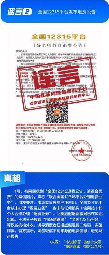 ??公共政策領(lǐng)域謠言誤導(dǎo)公眾決策?!吧绫?]有有效期限制、未到期不能換新卡”是對社??ü芾碚叩恼`讀,給民眾平添困擾;“28家博物館元旦期間閉館”實為少數(shù)博物館根據(jù)運營安排所做的微調(diào),網(wǎng)帖嚴(yán)重夸大實際閉館情況,引發(fā)負(fù)面炒作;“深圳有望推行12年義務(wù)教育,高中免費”是對現(xiàn)行政策的“超前編造”,誤導(dǎo)學(xué)生及家長群體;“全國12315平臺發(fā)布退費公告”,則是假冒監(jiān)管機構(gòu)名義散播不實通知,為后續(xù)詐騙行為做鋪墊。