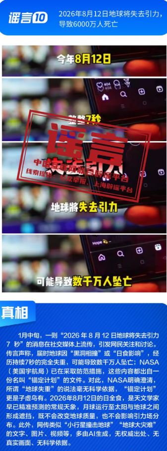 ??健康與科普領(lǐng)域謠言違背客觀規(guī)律?!叭搜椎鞍资恰黾用庖吡Α姆▽殹笨桃饪浯笤撎幏剿幍呐R床用途,忽略其特定醫(yī)療場景與使用風(fēng)險;所謂“大棚草莓、冷庫葡萄、進(jìn)口車?yán)遄印⑷旧疤情偈嵌焖缢拇蠖就酢敝{言片面解讀農(nóng)產(chǎn)品種植與保鮮方式,缺乏科學(xué)依據(jù);“四川兩只雄性大熊貓首次成功自然交配”純屬為吸引流量而捏造的獵奇內(nèi)容,其視頻畫面為AI生成;“2026年8月12日地球?qū)⑹ヒ?,?dǎo)致6000萬人死亡”更是無中生有的荒謬謠言。