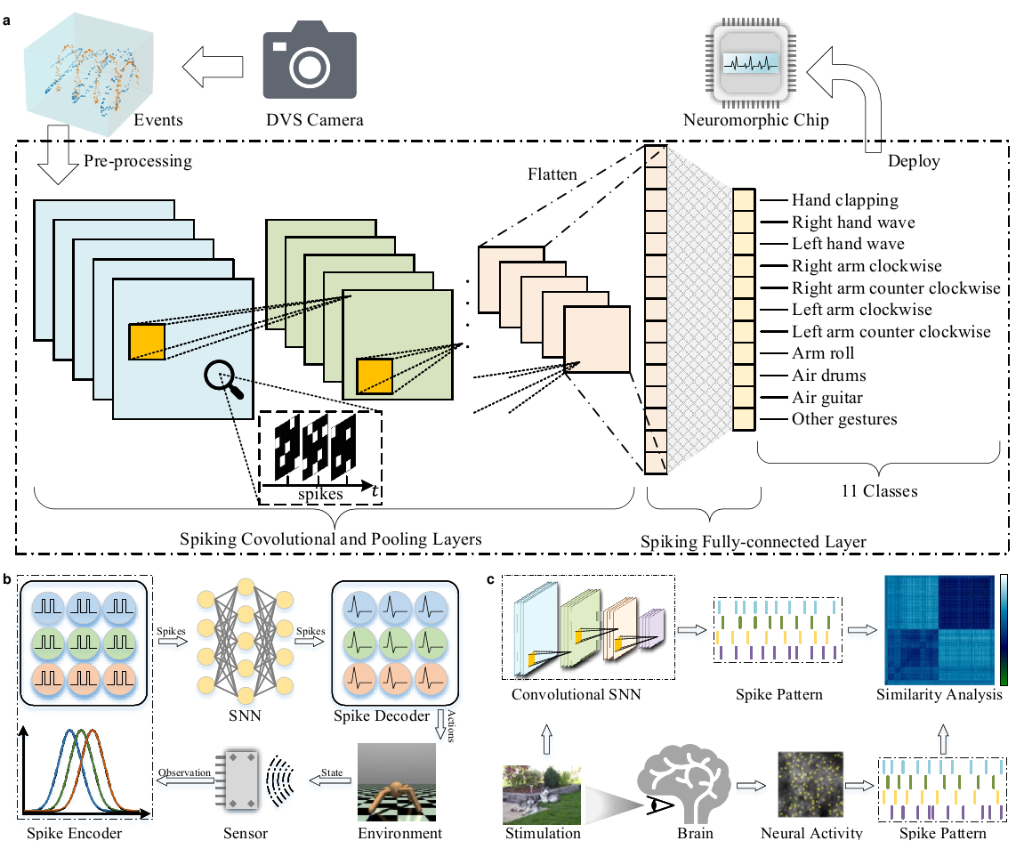 李國齊介紹,傳統(tǒng)脈沖神經(jīng)網(wǎng)絡(luò)框架更多地關(guān)注生物可解釋性,并不支持自動微分,無法充分利用GPU的大規(guī)模并行計算能力,也缺乏對神經(jīng)形態(tài)傳感器和計算芯片的支持。“驚蟄”框架很大程度上解決了上述問題,支持神經(jīng)形態(tài)數(shù)據(jù)處理、深度脈沖神經(jīng)網(wǎng)絡(luò)構(gòu)建和神經(jīng)形態(tài)芯片部署等多項功能。