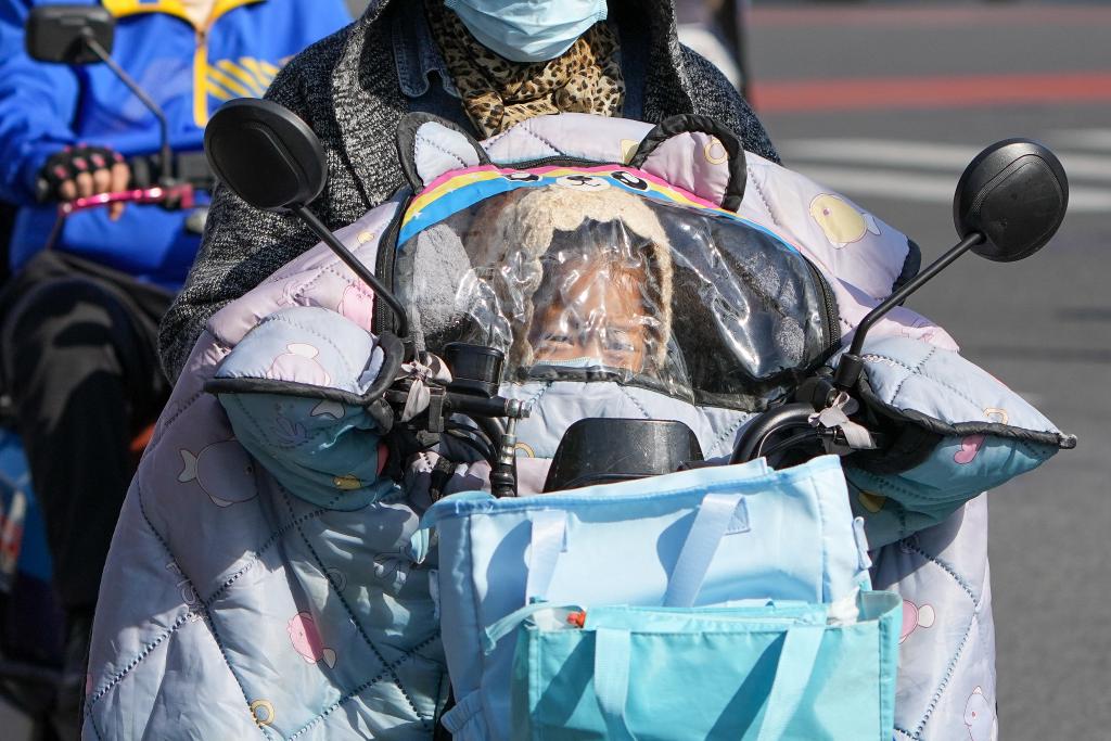 10月18日,一位小朋友在電動(dòng)自行車的擋風(fēng)后面躲風(fēng)。新華社記者 鞠煥宗 攝