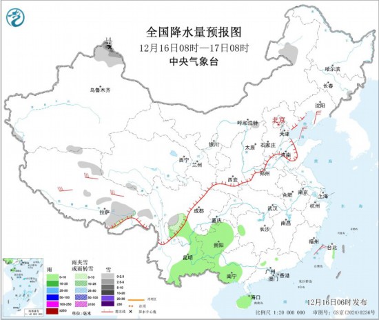 12月17日08時至18日08時,內(nèi)蒙古東北部、黑龍江西南部、新疆北部、川西高原南部等地部分地區(qū)有小到中雪或雨夾雪,其中,新疆阿勒泰地區(qū)和伊犁河谷局地有大到暴雪(10~16毫米)。西南地區(qū)南部、湖南西部、福建東北部、廣西西北部、海南島西南部等地部分地區(qū)有小到中雨,其中,云南東南部局地有大雨(25~35毫米)。西藏中北部等地部分地區(qū)有4~6級風;東海南部海域、臺灣海峽、巴士海峽、南海東北部和中東部海域將有5~7級大風、陣風8級。