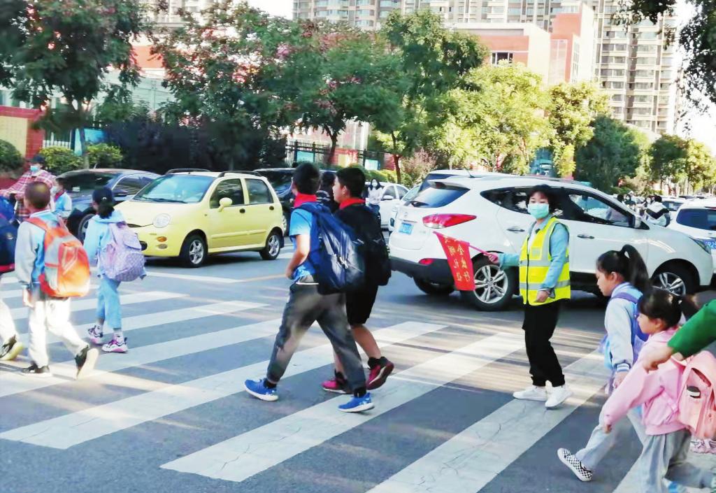忻州市長征小學(xué)位于交通情況復(fù)雜路段,開學(xué)以來,每天學(xué)校周圍送孩子上學(xué)的車輛較多,雖然有交警和學(xué)校護(hù)崗人員在現(xiàn)場(chǎng)指揮,但人與車往往交織在一起,存在安全隱患,于是長征小學(xué)六年級(jí)家長們自愿參與,輪流擔(dān)任護(hù)學(xué)專人,每天提前半小時(shí)到崗,在學(xué)生必經(jīng)之道護(hù)送學(xué)生過馬路。圖為護(hù)學(xué)人員“護(hù)航”學(xué)生通過斑馬線。 (李 濤 攝)
