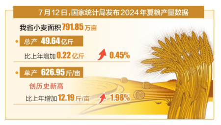 本報(bào)訊(記者王秀娟)7月12日,國(guó)家統(tǒng)計(jì)局發(fā)布2024年夏糧產(chǎn)量數(shù)據(jù),我省小麥面積791.85萬(wàn)畝;總產(chǎn)49.64億斤,比上年增加0.22億斤,增長(zhǎng)0.45%;單產(chǎn)626.95斤/畝,創(chuàng)歷史新高,比上年增加12.19斤/畝,增長(zhǎng)1.98%。