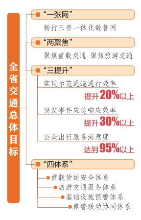 其中,“一張網”指搭建一張暢行三晉一體化數智網。“兩聚焦”是重點聚焦重載交通、旅游交通。“三提升”是實現(xiàn)示范通道通行效率提升20%以上,突發(fā)事件應急響應效率提升30%以上,公眾出行服務滿意度達到95%以上?!八捏w系”則是形成重載貨運安全體系、旅游交通服務體系、基礎設施預警體系和路警聯(lián)動協(xié)同體系。