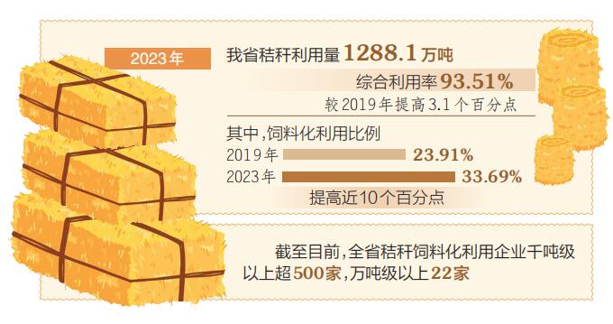 曾經(jīng),秸稈被認(rèn)為是農(nóng)業(yè)的負(fù)擔(dān),無論是“一燒了之”還是棄之荒野,都是環(huán)境的“瘡疤”。秸稈綜合利用對(duì)于提高農(nóng)村經(jīng)濟(jì)效益、增加農(nóng)民收入、保護(hù)農(nóng)村生態(tài)環(huán)境意義重大。今年的中央一號(hào)文件提出“支持秸稈綜合利用,精準(zhǔn)劃定禁燒范圍,依法依規(guī)落實(shí)禁燒管控要求”。前不久印發(fā)的《加快建設(shè)農(nóng)業(yè)強(qiáng)國規(guī)劃(2024-2035年)》提出“推進(jìn)農(nóng)業(yè)面源污染綜合防治,發(fā)展生態(tài)循環(huán)農(nóng)業(yè)”。 近年來,我省以提高秸稈綜合利用能力為目標(biāo),將秸稈飼料化利用作為重點(diǎn)方向,持續(xù)推進(jìn)“秸稈變?nèi)狻薄敖斩捵兡獭?。從田間廢棄物變?yōu)楫a(chǎn)業(yè)“新資源”,我省秸稈正經(jīng)歷著一場(chǎng)華麗蛻變,書寫出山西農(nóng)業(yè)綠色發(fā)展的生動(dòng)實(shí)踐。 變廢為寶 拓寬升值空間 4月20日,記者走進(jìn)朔州市駿寶宸農(nóng)業(yè)科技股份有限公司的牧草生產(chǎn)基地,只見大型裹包機(jī)正在高效運(yùn)轉(zhuǎn),3000多噸秸稈黃貯經(jīng)過發(fā)酵、粉碎、壓實(shí)后,被迅速包裹成圓柱狀的“營養(yǎng)罐頭”,運(yùn)往全國各地牧場(chǎng),成為牛羊的“盤中餐”。 駿寶宸公司是我省重點(diǎn)培育的牧草產(chǎn)業(yè)集群省級(jí)龍頭企業(yè),專業(yè)從事飼草育種、種植、加工及其全產(chǎn)業(yè)鏈社會(huì)化服務(wù),總經(jīng)理高林介紹,公司去年收儲(chǔ)秸稈11萬噸,加工全混合日糧36.5萬噸,可供養(yǎng)殖肉牛數(shù)量4.85萬頭。近幾年逐步布局南方收儲(chǔ)基地,新增河北黃驊、陜西寶雞、甘肅張家川、湖北公安、安徽鳳陽為產(chǎn)業(yè)基地區(qū)域,發(fā)展玉米秸稈、紫花苜蓿等收儲(chǔ)。2024年公司銷售收入10376萬元。 在離駿寶宸公司不到20公里的朔州市大農(nóng)禾農(nóng)業(yè)有限公司,牛棚里“哞哞”聲不斷,工人們忙碌地將秸稈從運(yùn)輸車上卸下、搬運(yùn)、打捆。 “我們公司目前的肉牛存欄是2000頭。這些秸稈都是我們的‘寶貝’,經(jīng)過加工處理后,就成為肉牛的優(yōu)質(zhì)飼料?!倍麻L李濤介紹說,公司年生產(chǎn)秸稈飼料7萬噸,其中1.5萬噸供自己的牛吃,其余外銷。 “原來一把火燒掉的秸稈,現(xiàn)在變成牛羊的‘營養(yǎng)餐’,這在以前想都不敢想!”在大農(nóng)禾公司的草料儲(chǔ)藏庫,記者偶遇了山陰縣安榮鄉(xiāng)八步堰村種植大戶樊曉林,他承包了2000多畝土地,主要種玉米:“2023年我與大農(nóng)禾公司合作,所產(chǎn)秸稈全部用于公司的飼料加工,去年純收入80多萬元。” 山西古城乳業(yè)集團(tuán)有限公司是我省規(guī)模最大、產(chǎn)業(yè)鏈條最完整、產(chǎn)品結(jié)構(gòu)最齊全的乳制品專業(yè)產(chǎn)銷企業(yè),在這里,一車車青貯秸稈經(jīng)過切碎、混合、發(fā)酵等一系列工序后,成為奶牛的“美味佳肴”?!拔覀児粳F(xiàn)在牛存欄10萬頭,年收玉米秸稈干草2萬噸左右,青貯6萬噸。秸稈為奶牛提供了豐富的營養(yǎng),是產(chǎn)出優(yōu)質(zhì)牛奶的關(guān)鍵?!惫径麻L郭俊告訴記者。 秸稈為何能成為肉和奶的“源頭”?因?yàn)榻斩捄胸S富的營養(yǎng)物質(zhì),農(nóng)作物光合作用的產(chǎn)物有一半以上存在于秸稈中,1噸普通秸稈的營養(yǎng)價(jià)值平均與0.25噸糧食的營養(yǎng)價(jià)值相當(dāng)。通過物理、化學(xué)、生物等處理方法,秸稈成為優(yōu)質(zhì)的飼料來源。 數(shù)據(jù)顯示,2023年,我省秸稈利用量1288.1萬噸,綜合利用率93.51%,較2019年提高3.1個(gè)百分點(diǎn)。其中,飼料化利用比例從2019年的23.91%提高到2023年的33.69%,提高近10個(gè)百分點(diǎn)。在農(nóng)牧大市朔州市,每年秸稈利用量大約在100萬噸以上,按照畜牧部門的牛羊存欄量,結(jié)合實(shí)際飼養(yǎng)過程中的干草使用比例,朔州市每年秸稈飼料化的需求約為110萬噸,本地產(chǎn)的秸稈基本被“吃干榨凈”,有時(shí)還需要外調(diào)。2024年,朔城區(qū)的秸稈綜合利用項(xiàng)目帶動(dòng)約5000農(nóng)戶,增收約600萬元;懷仁市的秸稈綜合利用項(xiàng)目帶動(dòng)當(dāng)?shù)鼐蜆I(yè)100人次,產(chǎn)生經(jīng)濟(jì)效益825萬元。 技術(shù)革新 秸稈“華麗變身” “我們公司集肉牛養(yǎng)殖、繁育為一體,現(xiàn)存欄肉牛500頭,年飼料化利用秸稈約3650噸。我們應(yīng)用‘秸稈揉絲+預(yù)混料+生物菌拌料’的飼喂技術(shù),使得肉牛采食速度提高約40%,秸稈利用率提高50%—98%?!痹跁x城市陽城縣犇犇養(yǎng)殖有限公司,公司監(jiān)事茹小粉介紹說,優(yōu)選未變質(zhì)、含水量13%以下的小麥、玉米秸稈,將秸稈粉碎揉細(xì)至2—3cm,拌菌后裹包貯存,就是秸稈揉搓絲化加工。 據(jù)了解,經(jīng)過揉絲加工后的飼草含有豐富的維生素、蛋白質(zhì)、脂肪、纖維素,氣味酸甜芳香,適口性好,消化率高,可供四季飼喂。利用打捆機(jī)壓縮打捆后裝袋貯存,可保存1—3年。 揉絲技術(shù)是秸稈實(shí)現(xiàn)“華麗變身”的途徑之一。近年來,我省秸稈綜合利用技術(shù)模式日趨成熟,發(fā)布了秸稈青貯、秸稈黃貯揉絲化加工等13項(xiàng)秸稈綜合利用主推技術(shù),總結(jié)形成了“種養(yǎng)循環(huán)”集中收儲(chǔ)利用模式、“龍頭企業