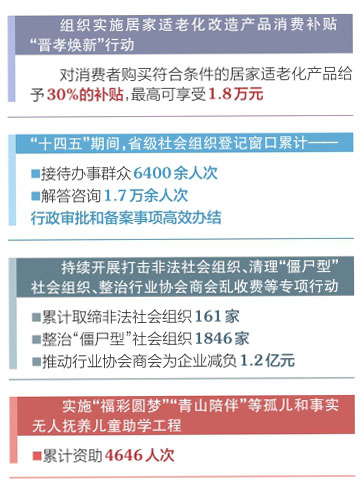“十四五”期間,我省堅持“規(guī)范與發(fā)展并重、監(jiān)管與服務(wù)并舉”,持續(xù)深化改革,健全體制機制,完善政策措施,推動社會組織高質(zhì)量發(fā)展取得新成效。推行“零見面審批、最多跑一次”和線上年報“零跑動”,省、市、縣三級社會組織登記實現(xiàn)“一網(wǎng)通辦”。統(tǒng)一規(guī)范申請材料、表格表單、辦事流程、章程文本等,政務(wù)服務(wù)標(biāo)準(zhǔn)化、規(guī)范化水平持續(xù)提升。推進(jìn)社會組織規(guī)范化建設(shè),健全綜合監(jiān)管、聯(lián)合執(zhí)法、資金管理等制度機制,加強對社會組織名稱、宗旨、業(yè)務(wù)范圍、發(fā)起人和擬任負(fù)責(zé)人的審核把關(guān),強化對社會組織內(nèi)部治理、人員、資金、活動等日常監(jiān)管。持續(xù)開展打擊非法社會組織、清理“僵尸型”社會組織、整治行業(yè)協(xié)會商會亂收費等專項行動,推動行業(yè)協(xié)會商會為企業(yè)減負(fù)1.2億元。