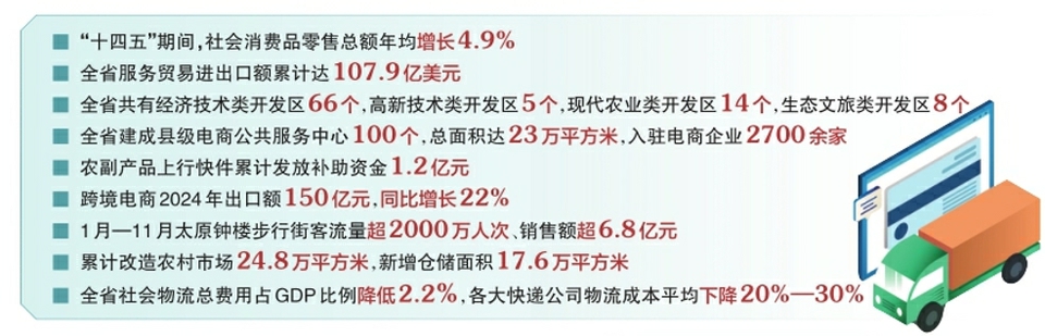 “‘十四五’期間,省商務(wù)廳充分發(fā)揮區(qū)位、資源與產(chǎn)業(yè)優(yōu)勢,出臺對外開放‘1+N’政策體系,發(fā)展外貿(mào)新業(yè)態(tài)新模式,穩(wěn)住了外貿(mào)基本盤。”省商務(wù)廳副廳長李國榮介紹說,包括外向型經(jīng)濟(jì)指標(biāo)穩(wěn)中有進(jìn),全省實(shí)際使用外資累計(jì)36.8億美元,全省非金融類對外直接投資額累計(jì)12.5億美元;開放平臺能級不斷提升,支持武宿綜保區(qū)加快“五大中心”建設(shè),支持山西方略、大同國際陸港、山西蘭花3個保稅物流中心拓展保稅物流、倉儲等功能;開放通道建設(shè)穩(wěn)步推進(jìn),大同、運(yùn)城航空口岸與太原航空口岸共同構(gòu)成“南北一線”的口岸布局。中歐班列提質(zhì)增效,累計(jì)開行1048列。出臺鐵海聯(lián)運(yùn)支持政策,形成中鼎物流園—天津港、中鼎物流園—青島港兩條圖定班列。太原國際郵件互換局?jǐn)U容升級項(xiàng)目投入運(yùn)營;開放環(huán)境持續(xù)優(yōu)化,全面推廣山西國際貿(mào)易“單一窗口”平臺應(yīng)用,太原航空口岸列入國家240小時過境免簽政策適用口岸范圍,加大進(jìn)出口信貸等金融支持力度,推動貿(mào)易外匯收支便利化政策擴(kuò)面提質(zhì)。
