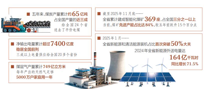 12月17日上午,中共山西省委宣傳部、山西省人民政府新聞辦公室舉行“高質(zhì)量完成‘十四五’規(guī)劃”系列主題第二十二場(chǎng)新聞發(fā)布會(huì),省能源局有關(guān)負(fù)責(zé)同志介紹情況,并回答記者提問。 “十四五”以來,全省能源系統(tǒng)始終把保障國(guó)家能源安全,讓百姓用上更清潔、更安全、更經(jīng)濟(jì)的能源作為頭等大事,推進(jìn)煤炭更綠色、電力更清潔、新能源更給力、天然氣更實(shí)惠,“十四五”能源規(guī)劃各項(xiàng)目標(biāo)任務(wù)全面完成,為全省經(jīng)濟(jì)高質(zhì)量發(fā)展和全方位轉(zhuǎn)型提供堅(jiān)實(shí)支撐。 能源結(jié)構(gòu)優(yōu)化取得歷史性突破 我省堅(jiān)持新能源與傳統(tǒng)能源協(xié)同,加快建設(shè)煤炭綠色開發(fā)利用基地、電力外送基地、非常規(guī)天然氣基地,能源供應(yīng)韌性大幅增強(qiáng),能源安全保障能力持續(xù)提高。 省能源局黨組書記、局長(zhǎng)張翔介紹,五年來,我省持續(xù)強(qiáng)化煤電兜底保障作用,同時(shí)大力提升清潔能源發(fā)展水平,新型電力系統(tǒng)建設(shè)進(jìn)一步加快。今年1月,山西清潔電力裝機(jī)量首次超過煤電,每用3度電就有1度是清潔電。建成了全國(guó)首個(gè)省級(jí)電力現(xiàn)貨市場(chǎng),2萬多家企業(yè)參與交易,買賣雙方深度撮合,讓電價(jià)更合理。此外,為用電集中的開發(fā)區(qū)量身定制了一批綠電園區(qū),讓綠電通過專線,更快更直接地與用戶連接,讓算力、化工、冶金這些高耗能產(chǎn)業(yè)用上了便宜又清潔的電。 省能源局副局長(zhǎng)、新聞發(fā)言人杜青表示,“十四五”以來,我省立足豐富風(fēng)光資源稟賦,堅(jiān)持“集中式規(guī)模化開發(fā)與分布式多元化利用并舉”的發(fā)展路徑,推動(dòng)風(fēng)電、光伏發(fā)電等可再生能源實(shí)現(xiàn)跨越式發(fā)展,裝機(jī)規(guī)模、發(fā)電量占比實(shí)現(xiàn)雙躍升,能源結(jié)構(gòu)優(yōu)化取得歷史性突破,產(chǎn)業(yè)集群效應(yīng)持續(xù)凸顯。 2021年至2024年,全省風(fēng)光新增裝機(jī)連續(xù)四年保持增長(zhǎng)態(tài)勢(shì),年均增速達(dá)16.8%;2025年1月,全省新能源和清潔能源裝機(jī)占比首次突破50%大關(guān),提前完成“十四五”規(guī)劃目標(biāo)。 晉北采煤沉陷區(qū)新能源基地項(xiàng)目成為國(guó)家推進(jìn)“雙碳”目標(biāo)布局的12個(gè)大型風(fēng)電光伏基地之一,建成投產(chǎn)后預(yù)計(jì)每年可向京津冀輸送清潔電力270億千瓦時(shí)。抽水蓄能累計(jì)布局項(xiàng)目16個(gè),形成1個(gè)現(xiàn)役電站、4個(gè)在建項(xiàng)目、3個(gè)新核準(zhǔn)項(xiàng)目、8個(gè)前期工作項(xiàng)目的發(fā)展格局,總裝機(jī)2020萬千瓦,可滿足全省2030年前可再生能源消納需求。全省已投運(yùn)新型儲(chǔ)能項(xiàng)目70個(gè)、規(guī)模294萬千瓦。 我省先后出臺(tái)多項(xiàng)政策文件,從要素保障、政策支持、技術(shù)指引等方面為產(chǎn)業(yè)發(fā)展保駕護(hù)航。創(chuàng)新推出“標(biāo)準(zhǔn)地”儲(chǔ)備制度,引導(dǎo)項(xiàng)目提前完成土地平整、規(guī)劃許可、環(huán)評(píng)安評(píng)等前期工作,縮短項(xiàng)目落地周期,2024年新能源項(xiàng)目轉(zhuǎn)化率超80%。依托國(guó)家級(jí)重大創(chuàng)新平臺(tái)和省級(jí)重點(diǎn)實(shí)驗(yàn)室體系,加快煤炭清潔利用、智能電網(wǎng)、氫能、儲(chǔ)能等關(guān)鍵技術(shù)的研發(fā)與應(yīng)用。風(fēng)、光、儲(chǔ)產(chǎn)業(yè)鏈技術(shù)水平、產(chǎn)業(yè)規(guī)模持續(xù)提升。 煤炭產(chǎn)業(yè)高端化智能化綠色化發(fā)展 我省立足煤炭資源稟賦和產(chǎn)業(yè)優(yōu)勢(shì),全面提高煤炭供給體系質(zhì)量,煤炭產(chǎn)業(yè)高端化、智能化、綠色化發(fā)展步伐加快。 “全省已有數(shù)百座煤礦實(shí)現(xiàn)智能化開采,構(gòu)建了覆蓋建設(shè)、生產(chǎn)、洗選、管理全流程的標(biāo)準(zhǔn)體系,工作面智能采掘、硐室無人值守、智慧煤流運(yùn)輸、露天無人礦卡等全面應(yīng)用,5G入井賦能安全生產(chǎn),危險(xiǎn)崗位逐步推進(jìn)機(jī)器人替代,不僅工人師傅的勞動(dòng)強(qiáng)度顯著降低,井下作業(yè)也更安全。”張翔說,當(dāng)前,煤礦先進(jìn)產(chǎn)能占比達(dá)84%,較五年前躍升15個(gè)百分點(diǎn)。 省能源局副局長(zhǎng)毛曉文表示,作為煤炭大省,山西在保障國(guó)家煤炭供應(yīng)的同時(shí),也加快向智能綠色邁進(jìn),讓煤炭開采更智能、更清潔。 穩(wěn)產(chǎn)保供有力有效?!笆奈濉逼陂g,全省新增產(chǎn)能1.5億噸/年,日均產(chǎn)量穩(wěn)定在350萬噸以上,累計(jì)生產(chǎn)原煤約65億噸,占全國(guó)總產(chǎn)量的近三成;以長(zhǎng)協(xié)價(jià)為24個(gè)省份保供電煤20億噸以上,有力保障了國(guó)家經(jīng)濟(jì)社會(huì)發(fā)展用能需要。 智能化建設(shè)穩(wěn)步推進(jìn)。我省加強(qiáng)頂層設(shè)計(jì)、強(qiáng)化標(biāo)準(zhǔn)引領(lǐng)、推動(dòng)試點(diǎn)示范,出臺(tái)評(píng)定辦法和指導(dǎo)手冊(cè),從采掘入手,逐步過渡到全礦井智能化建設(shè)。打造了全國(guó)首個(gè)省級(jí)煤炭工業(yè)互聯(lián)網(wǎng)平臺(tái),引進(jìn)華為礦山油氣軍團(tuán)全球總