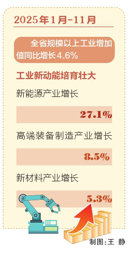 數(shù)據(jù)顯示,2025年1月—11月,全省規(guī)模以上工業(yè)增加值同比增長(zhǎng)4.6%,工業(yè)新動(dòng)能培育壯大,新能源產(chǎn)業(yè)增長(zhǎng)27.1%,高端裝備制造產(chǎn)業(yè)增長(zhǎng)8.5%,新材料產(chǎn)業(yè)增長(zhǎng)5.3%,為全省經(jīng)濟(jì)發(fā)展提供了堅(jiān)實(shí)支撐。