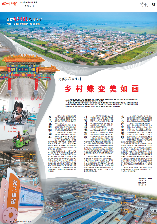 崔家莊村工業(yè)基礎(chǔ)雄厚,自然形成了以法蘭鍛造為主的企業(yè)聚集工業(yè)區(qū),共有鍛造企業(yè)50戶,規(guī)模以上企業(yè)21戶,機加工企業(yè)67戶。其中,國家級“專精特新”小巨人企業(yè)1戶,省級“專精特新”企業(yè)8戶,省級專精特新“小巨人”企業(yè)4戶,高新技術(shù)企業(yè)4戶,從業(yè)人員2300余人,人均可支配收入約2.8萬元。通過技術(shù)創(chuàng)新、集群發(fā)展和產(chǎn)業(yè)鏈延伸,法蘭產(chǎn)業(yè)不僅解決了崔家莊村的就業(yè)問題,更帶動了區(qū)域經(jīng)濟轉(zhuǎn)型升級,為鄉(xiāng)村振興提供了實踐樣本。