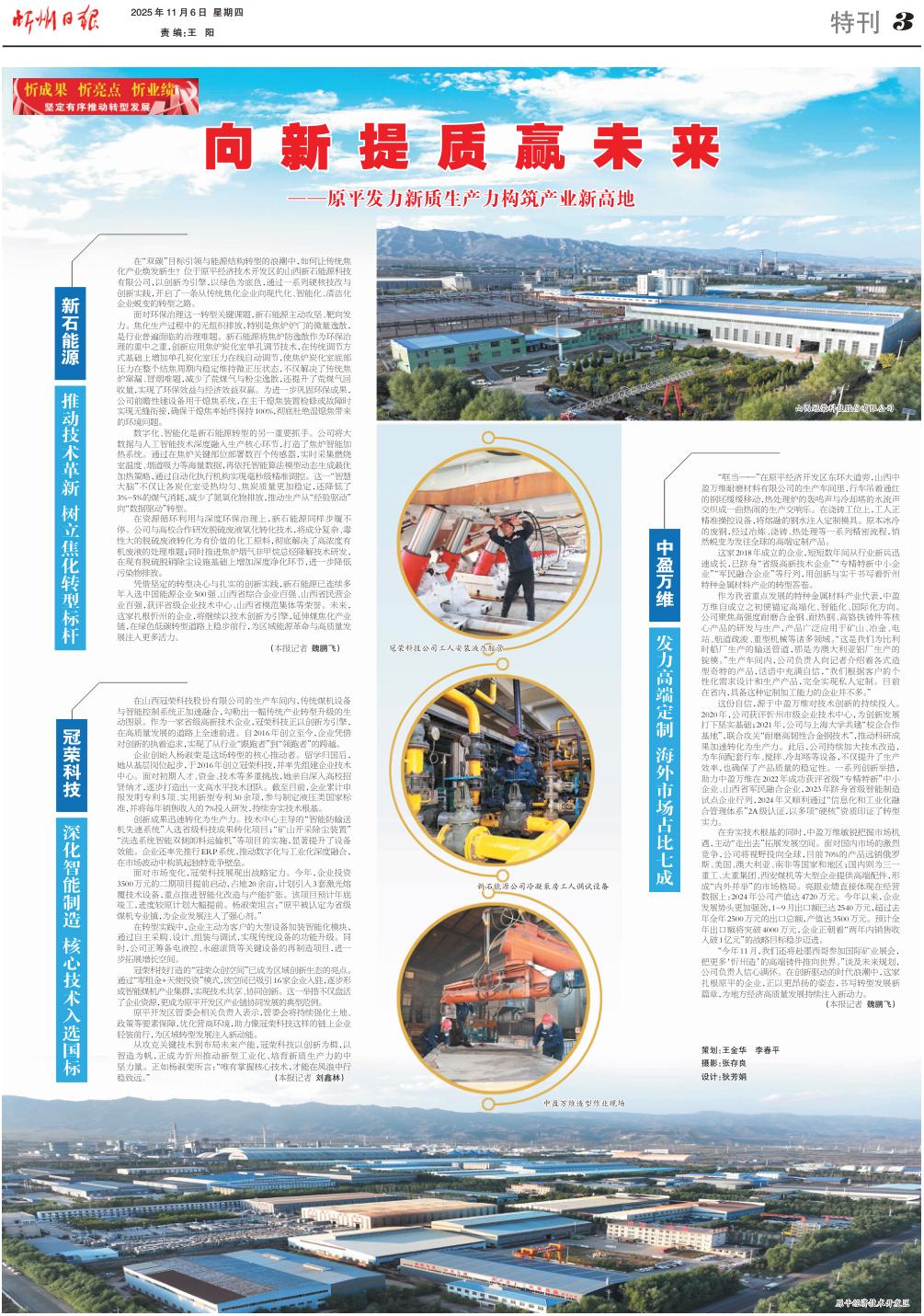 從攻克關(guān)鍵技術(shù)到布局未來產(chǎn)能,冠榮科技以創(chuàng)新為楫,以智造為帆,正成為忻州推動新型工業(yè)化、培育新質(zhì)生產(chǎn)力的中堅力量。正如楊淑榮所言:“唯有掌握核心技術(shù),才能在風(fēng)浪中行穩(wěn)致遠(yuǎn)。”(本報記者劉鑫林)