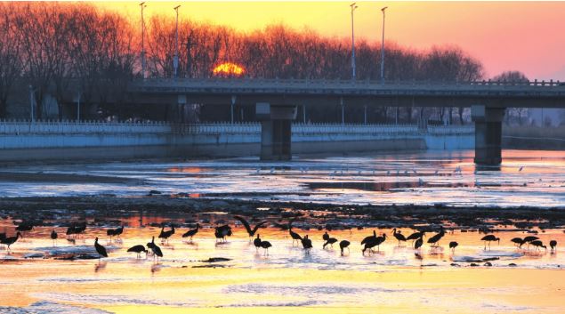 作為國家4A級(jí)旅游景區(qū),滹源景區(qū)依托滹沱河生態(tài)資源而建,220萬平方米的區(qū)域內(nèi),“一帶二廊三區(qū)串珠狀”的分布格局,將濕地、河島、蘆葦蕩等多樣生態(tài)景觀有機(jī)串聯(lián)。全長80公里的滹沱河穿境而過,橡膠壩蓄水形成的連片淺灘水質(zhì)澄澈,魚蝦、水生昆蟲等生物資源豐沛,完美契合了黑鸛淺水區(qū)覓食、喜靜避擾的生活習(xí)性,為它們提供了理想的棲息環(huán)境。