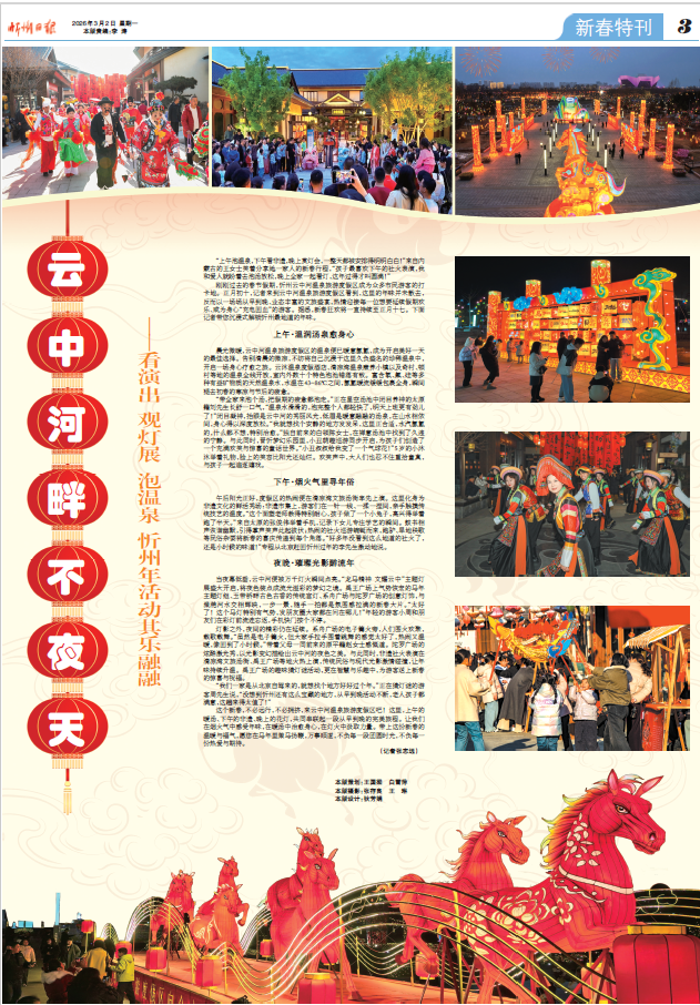剛剛過(guò)去的春節(jié)假期,忻州云中河溫泉旅游度假區(qū)成為眾多市民游客的打卡地。正月初十,記者來(lái)到云中河溫泉旅游度假區(qū)看到,這里的年味并未散去,反而以一場(chǎng)場(chǎng)從早到晚、業(yè)態(tài)豐富的文旅盛宴,熱情迎接每一位想要延續(xù)假期歡樂、或?yàn)樯硇摹俺潆娀匮钡挠慰?。?jù)悉,新春狂歡將一直持續(xù)至正月十七。下面記者帶您沉浸式解鎖忻州最地道的年味。