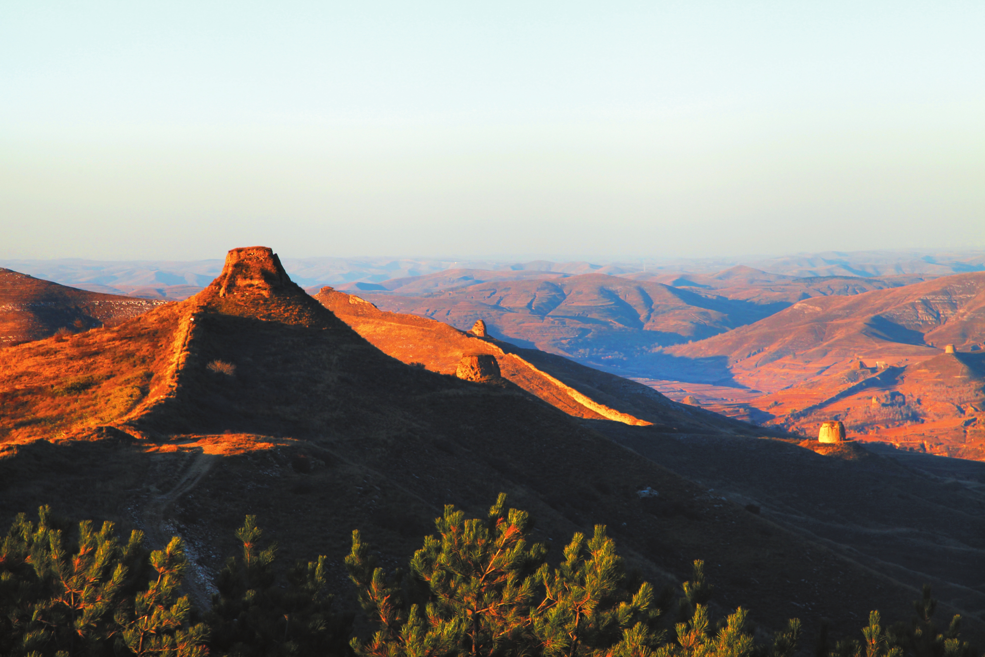 站在雄偉的柏楊嶺主峰上,迎風(fēng)而立,可看到連綿的大好河山和縱橫交錯(cuò)的內(nèi)外長(zhǎng)城。偏關(guān)境內(nèi)表里河山,營(yíng)堡、敵樓、望臺(tái)星羅棋布、烽堠聳立,彰顯著偏關(guān)首御、三關(guān)重鎮(zhèn)的地位。與綠波蕩漾的大片油松林帶以及紅黃相間的落葉松林帶相映襯,更顯得山河壯麗。