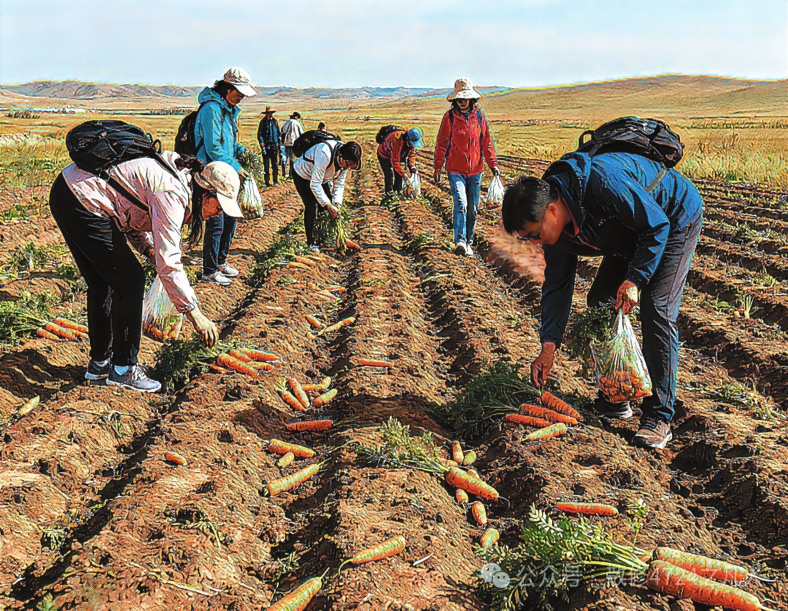 “撿秋”游演繹著“鄉(xiāng)土中國”的現(xiàn)代篇章。費(fèi)孝通在《鄉(xiāng)土中國》開篇即言“從基層上看去,中國社會是鄉(xiāng)土性的”。這種“鄉(xiāng)土性”的核心是人與土地的深度綁定。農(nóng)民靠土地生存,土地是文化認(rèn)同的根基?!皳烨铩边@種農(nóng)耕活動,如今以更加鮮活方式延續(xù)下來。對農(nóng)民而言,土地不僅是謀生手段,更是安身立命的“精神原鄉(xiāng)”。而城市游客的參與則賦予了“撿秋”新的意義。在城市里待久了,就想蹲在田里感受泥土的溫度,游客“撿秋”體驗(yàn)的是“春種秋收”踏實(shí)感。這種體驗(yàn)式參與是現(xiàn)代人對鄉(xiāng)土文明的“情感反哺”。游客們彎腰的身影既是對土地的致敬,也是對“根”的追尋。他們未必真懂農(nóng)事,但通過參與“撿秋”完成了對鄉(xiāng)土文化的認(rèn)同,被撿起的“果實(shí)”從“生存作物”演變?yōu)椤拔幕浇椤薄.?dāng)前,內(nèi)蒙古各地推出的挖土豆、烤土豆等旅游項(xiàng)目是對鄉(xiāng)土資源的文化再“編碼”,當(dāng)土豆從田間走向游客的后備箱,“鄉(xiāng)土中國”便獲得了更加豐富的表達(dá)。