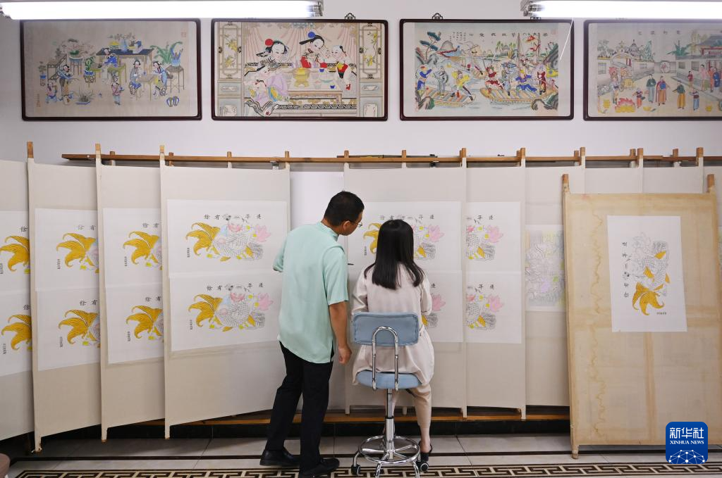 在天津市西青區(qū)的楊柳青霍氏古一張畫店,霍樹林(左)和妻子王丹一起進行彩繪(6月6日攝)。