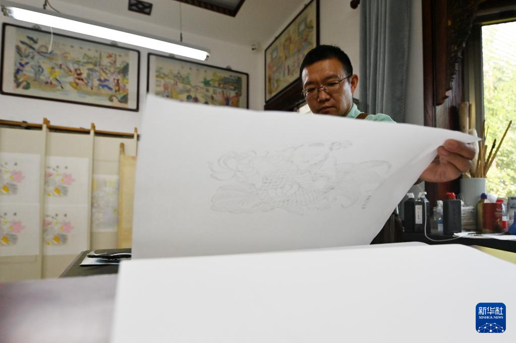 霍樹林在天津市西青區(qū)的楊柳青霍氏古一張畫店準備進行勾線(6月6日攝)。