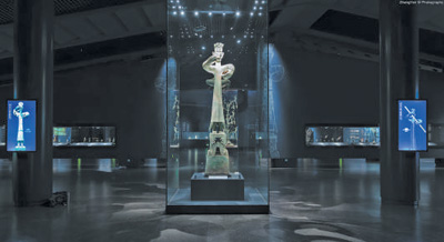 三星堆博物館展出的青銅大立人,旁邊采用多媒體技術(shù)展示其服飾與造型解讀。宋豪新 張 艷攝影報(bào)道