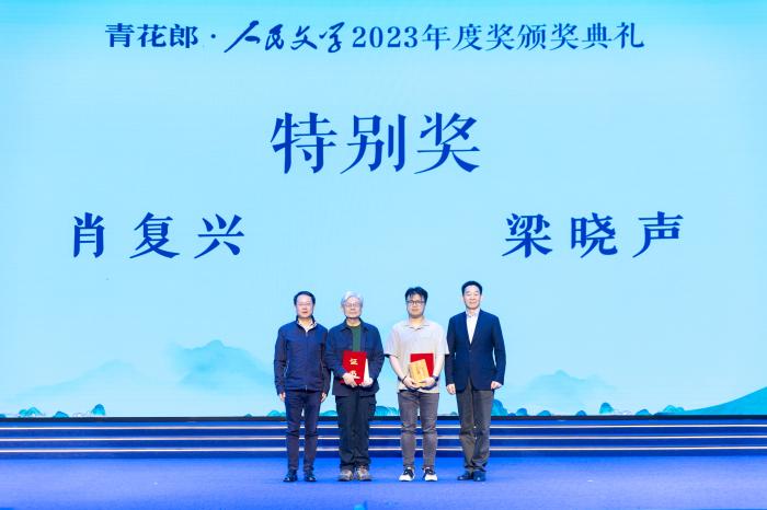 著名作家肖復(fù)興、梁曉聲獲得本屆“人民文學(xué)獎”特別獎,梁曉聲小說責(zé)任編輯梁豪代為領(lǐng)獎。圖片來源:主辦方供圖