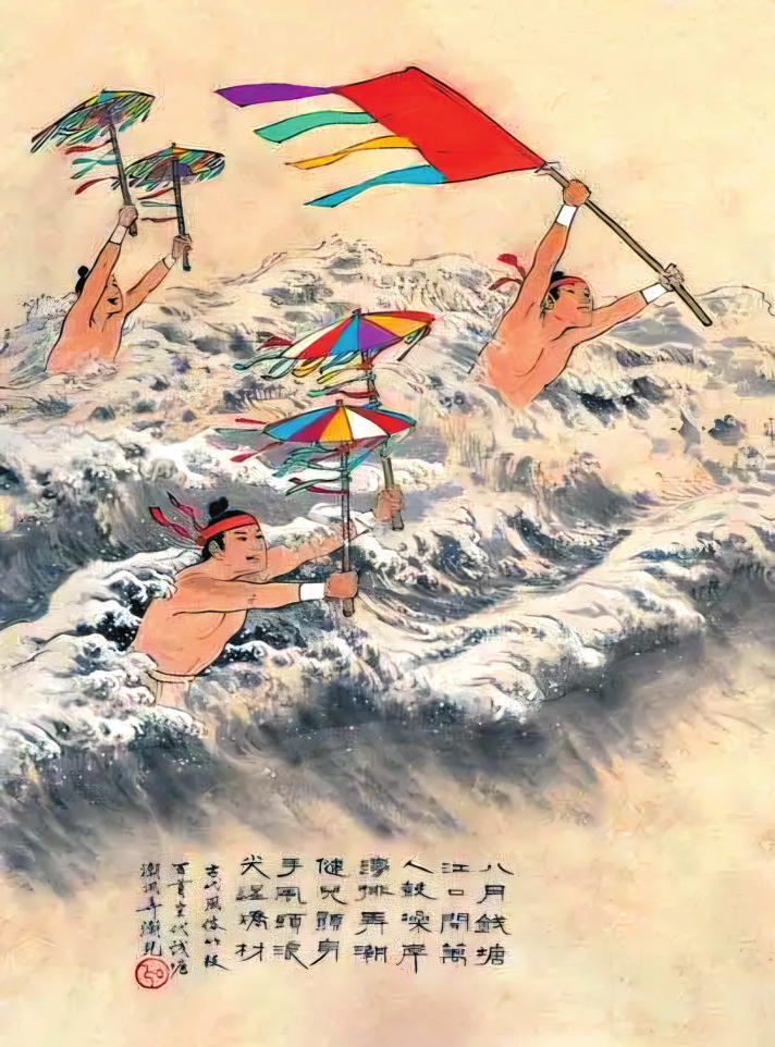 能在大江大河中搏擊風浪的游泳好手,被人們尊稱為“弄潮兒”。唐人李益曾作閨怨詩《江南曲》:“嫁得瞿塘賈,朝朝誤妾期。早知潮有信,嫁與弄潮兒?!蹦纤五X塘江弄潮是一大盛事,“浙江之潮,天下之偉觀也”。在“大聲如雷霆,震撼激射,吞天沃日,勢極雄豪”的潮水中,數(shù)百名弄潮兒“皆披發(fā)文身,手持十幅大彩旗,爭先鼓勇,溯迎而上,出沒于鯨波萬仞中,騰身百變,而旗尾略不沾濕,以此夸能”。辛棄疾夸他們“不怕蛟龍怒。風波平步??醇t旆驚飛,跳魚直上,蹙踏浪花舞”,潘閬更是贊嘆“弄潮兒向濤頭立,手把紅旗旗不濕”。