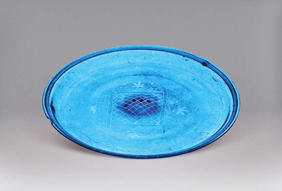 據(jù)地宮出土的物賬碑記載,整個(gè)地宮被布置得“窮天上之莊嚴(yán),極人間之煥麗”。在這些文物中,有六件來自阿拉伯國家的刻紋藍(lán)玻璃盤。玻璃盤保存完好,為無模吹制成形,通體藍(lán)色,晶瑩光潔,盤面刻滿紋飾,主體紋飾為以雙線勾勒出的十字形框架,盤心為正方形方框,方框外刻四個(gè)拱門形狀的尖瓣,與中心方框組成四個(gè)“米哈拉布”紋樣。“米哈拉布”是伊斯蘭教清真寺大殿的禮拜龕,四個(gè)尖瓣內(nèi)各刻一朵五瓣葉子植物紋,尖瓣之間也飾以植物紋。制作工藝是在玻璃成器之后,用比玻璃更堅(jiān)硬的工具在其表面淺刻花紋,加以描金,從而使得玻璃盤更為華麗。