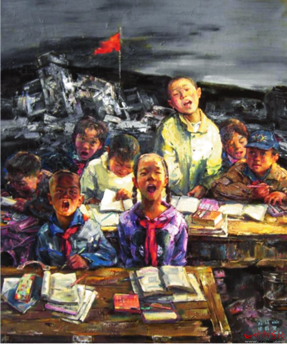 同樣表現(xiàn)地震題材的另一幅作品《震后復(fù)課》則展示出另外一種浪漫情懷,發(fā)人深省,令人感慨萬千。在尚未處理完畢的地震廢墟上,孩子們真誠地開始了希望的追求,展示著大震壓不垮的人性力量和災(zāi)后最具震撼力的希望。是的,紅旗在哪里,精神支撐就在哪里。孩子是希望,是未來。在孩子們的臉上,沒有恐懼和悲哀,沒有茫然與無助,有的只是對知識的渴望,對未來的憧憬。一個角落的復(fù)課場景,映射著中華民族偉大復(fù)興的精神力量。 邢晨聲 文