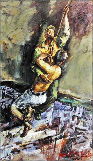 作品《空中救援》中,觀者首先感受到的就是難度。主題表現(xiàn)的事件難度和畫面表現(xiàn)處理的難度交織在一起,讓我們在驚險、焦急的心理壓力下感受到生命的脆弱??罩芯仍闪松奈ㄒ煌ǖ?。救援同樣是險象環(huán)生、驚心動魄。從畫面處理技巧上是一種挑戰(zhàn),天空與地面的透視關(guān)系,動感與靜態(tài)的對立統(tǒng)一,那種命懸一線的緊迫感對心理的沖擊力,通過大刀闊斧的刮刀、筆觸處理,和蒼涼緊迫的色調(diào)關(guān)系,準(zhǔn)確地展示了主題思想,大膽省略了一些不必要的細節(jié)描寫。用大筆觸、大色塊表現(xiàn)背景的壓抑和險峻,救援主體成為沖破這一重壓的希望之色。沒有去刻意刻畫天與地的真實場景,簡潔概括但不呆板空洞,這種果斷的駕馭,是續(xù)鶴賢真實實力的體現(xiàn)。 邢晨聲 文