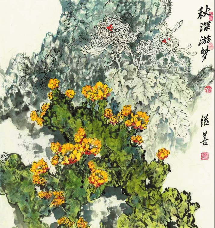 郜繼善的重彩花鳥(niǎo)畫(huà)偏傳統(tǒng),筆法細(xì)膩工整,色彩明麗典雅,構(gòu)圖大氣別致,情趣盎然,意境深遠(yuǎn)。作品中各種元素有機(jī)融合,自然穿插,形成和諧有序的布局,讓人既能感受到自然界的豐富與絢爛,又可體味藝術(shù)帶來(lái)的愉悅和感動(dòng)。在他的筆下,重彩成為了最具藝術(shù)感染力的手段,也是最有個(gè)性藝術(shù)特征的語(yǔ)言,鮮明、強(qiáng)烈,可謂“脫盡媚俗寫(xiě)重彩”。
