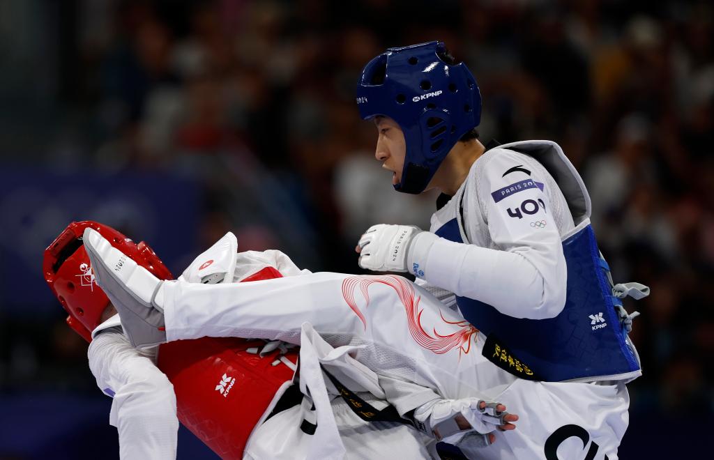 2024年8月8日,中國選手梁育帥(右)在巴黎奧運(yùn)會(huì)跆拳道男子68公斤級16強(qiáng)賽上。新華社記者 費(fèi)茂華 攝