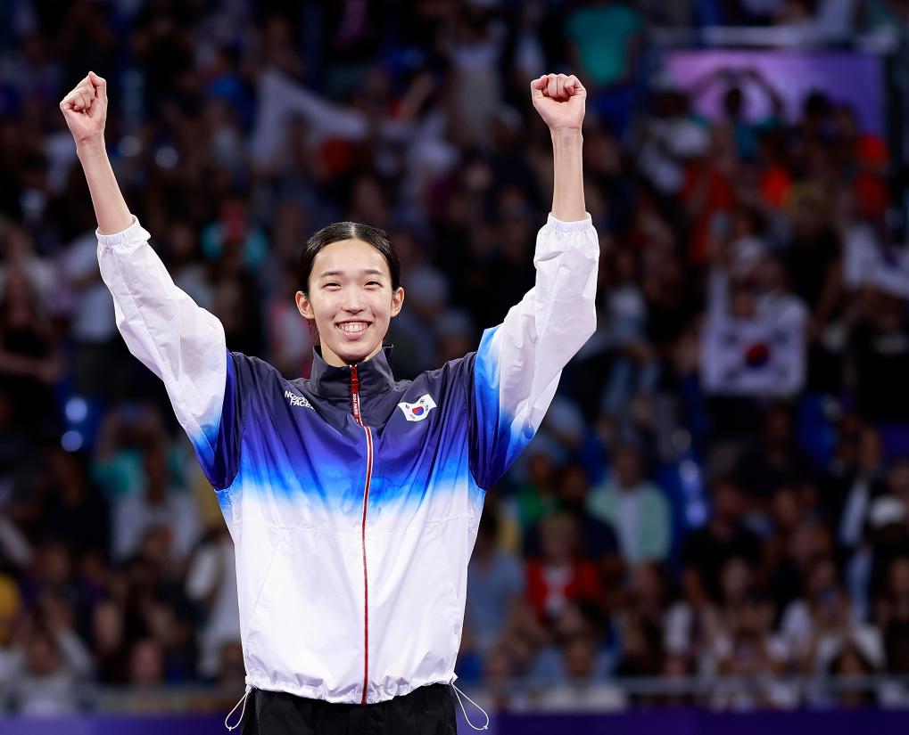 2024年8月8日,獲得冠軍的韓國選手金宥珍在巴黎奧運(yùn)會(huì)跆拳道女子57公斤級決賽頒獎(jiǎng)儀式上。新華社記者 費(fèi)茂華 攝