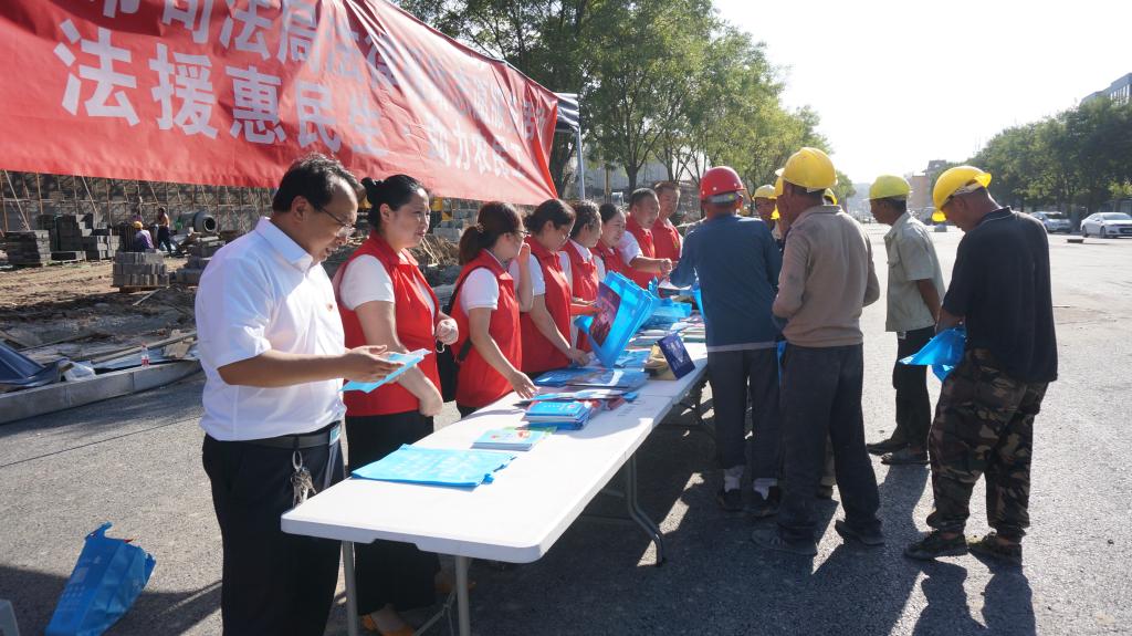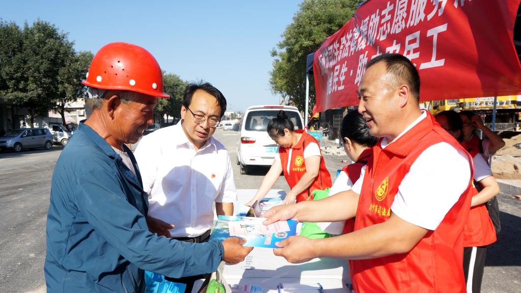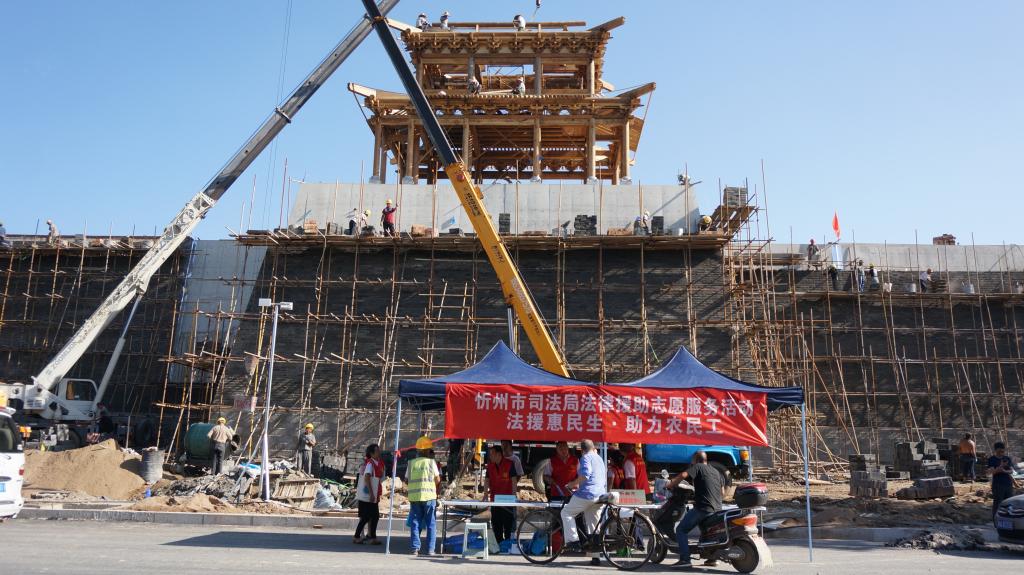為深入貫徹落實(shí)習(xí)近平新時(shí)代中國特色社會(huì)主義思想和黨的十九大及十九屆二中、三中、四中全會(huì)精神,貫徹落實(shí)《保障農(nóng)民工工資支付條例》和國家、山西省關(guān)于農(nóng)民工服務(wù)工作的部署,切實(shí)加強(qiáng)我市農(nóng)民工安全生產(chǎn)意識,提高農(nóng)民工的維權(quán)意識和維權(quán)能力,8月13日下午,忻州市司法局組織市法律援助中心、公證處、律師事務(wù)所、司法鑒定中心組成法律援助志愿服務(wù)隊(duì),走進(jìn)忻州古城建筑工地現(xiàn)場,開展了“法援惠民生·助力農(nóng)民工”法律援助志愿服務(wù)活動(dòng)。