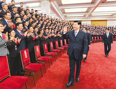 下午3時(shí)30分,習(xí)近平等來到人民大會(huì)堂北大廳,全場(chǎng)響起熱烈掌聲。習(xí)近平等向代表們揮手致意,同大家親切交流并合影留念。