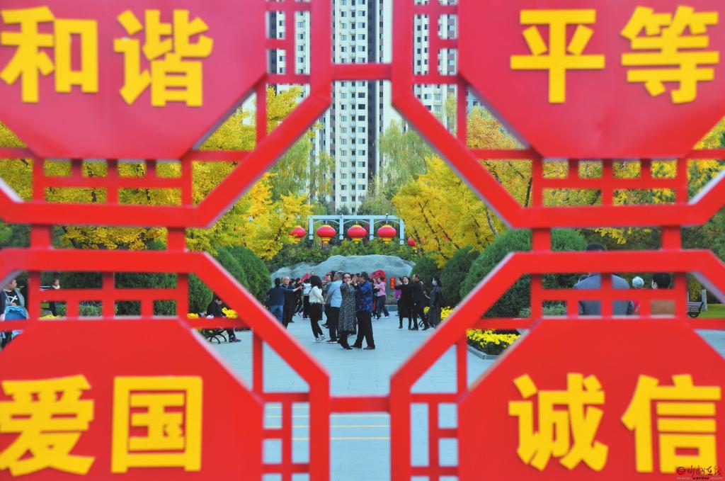 在我市中心城區(qū)的公園、廣場和城市綠地中,以社會主義核心價值觀、文明城市創(chuàng)建、優(yōu)秀傳統(tǒng)文化等為主題的宣傳展板、景觀造型隨處可見,在弘揚傳統(tǒng)文化、傳播城市文明的同時,給市民帶來視覺上的藝術(shù)享受,讓游客在游園賞景中受到熏陶。 (張存良 攝)