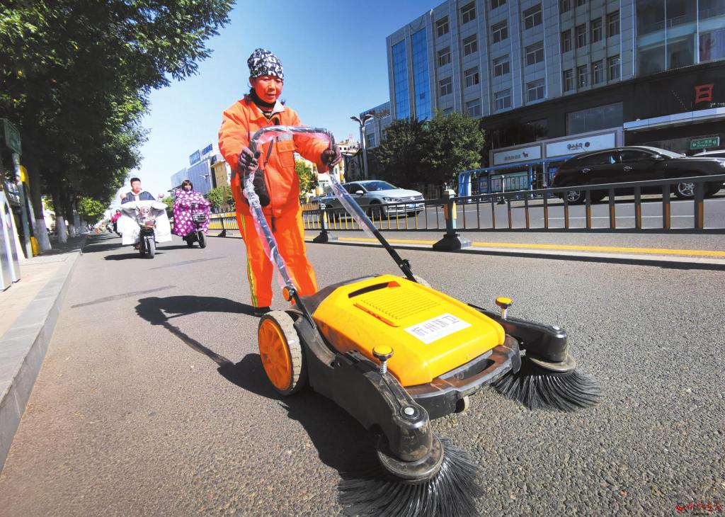 10月21日,環(huán)衛(wèi)工人在城區(qū)七一南路用新配置的無(wú)塵手推式掃地機(jī)進(jìn)行清掃作業(yè)。為鞏固提升創(chuàng)文成果,市環(huán)衛(wèi)處狠抓清掃保潔、嚴(yán)控二次污染,多舉措提升衛(wèi)生質(zhì)量,確保市民有良好的工作和生活環(huán)境。 (張存良 攝)