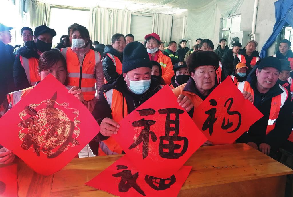 1月19日,民建忻州市委組織書法會(huì)員赴靜樂縣為50名環(huán)衛(wèi)和園林工人現(xiàn)場(chǎng)寫春聯(lián),并送上節(jié)日的問候。本報(bào)記者 李濤攝