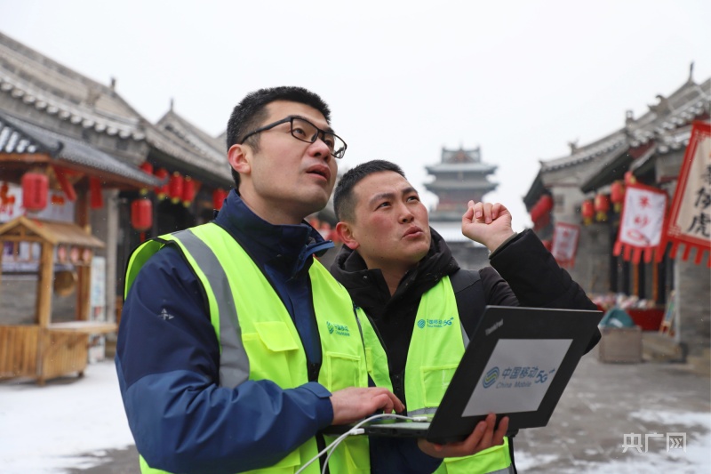 離開商鋪,郭勇和同事又來到古縣城十字街的中心點,這里是古縣城人流最為密集的地方,也是游客用網(wǎng)需求最大的地方?!霸谥行奈恢?,我們放置了2個5G基站,同時在城墻外放置了6個,內(nèi)城墻上放置了7個,還在一些網(wǎng)絡覆蓋較弱的小街道放置了‘微站’設備進行擴容。春節(jié)期間,我們還會組織應急保障隊進行通信保障,通過這樣的基站布局最大限度保障游客的通信順暢?!闭f話間,郭勇和同事一人操作電腦,一人操作手機已經(jīng)完成了此處的信號測試。