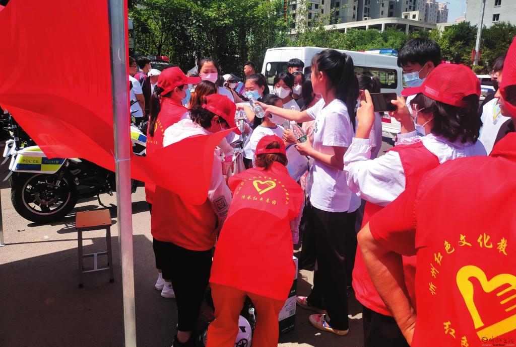 身穿愛心紅馬甲的志愿者為考生免費(fèi)送去礦泉水。 張志遠(yuǎn)攝
