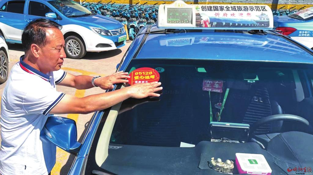 高考前夕,出租車司機(jī)在前擋風(fēng)玻璃上粘貼愛心送考標(biāo)識(shí)。 張林泉攝