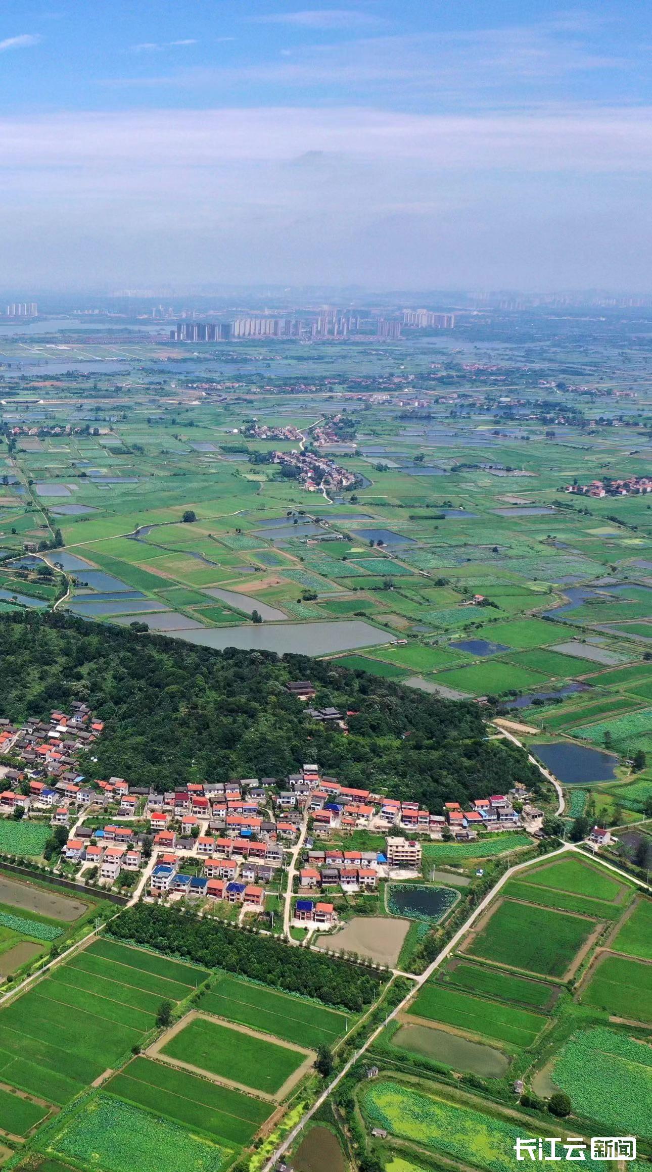 ▲鳥瞰春天的鄂州長港鎮(zhèn)峒山村,村容整潔、綠樹成蔭 照片里的這座山環(huán)水繞的美麗村莊,正是習近平總書記2013年7月視察湖北時到過的鄂州市長港鎮(zhèn)峒山村。一片片綠意蔥蘢的稻田,干凈整潔的村道縱橫交錯,呈現(xiàn)出一派迷人的田園風光。