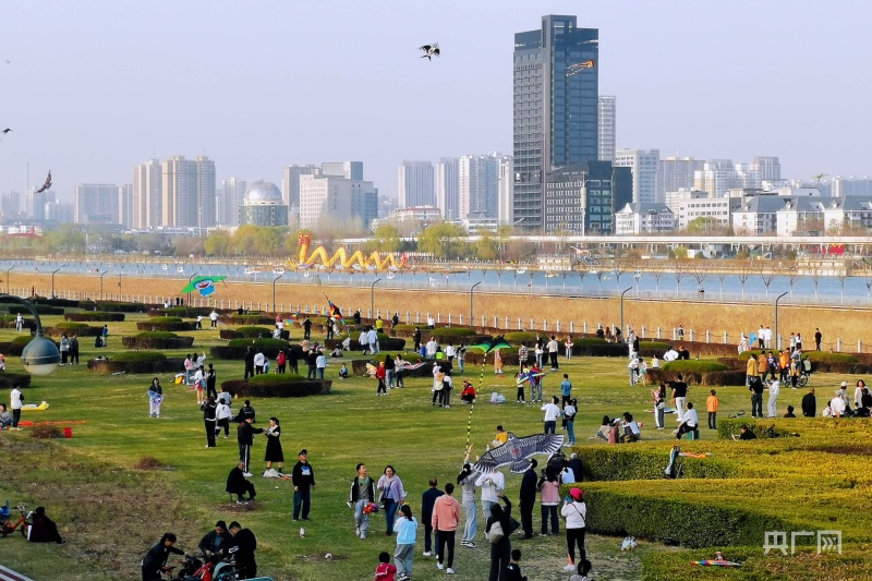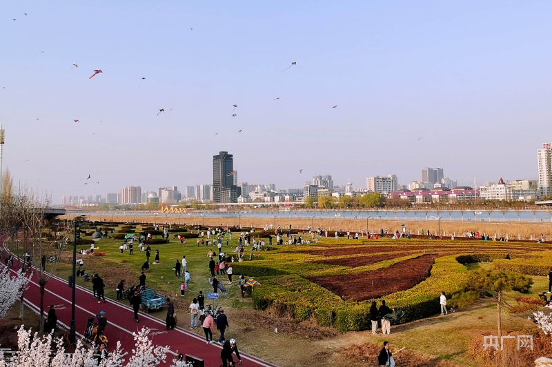 市民聚集在綠意盎然的汾河岸畔放風箏(央廣網記者 郎麒 攝)