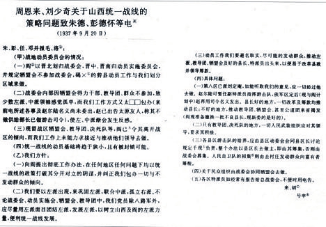 圖12 山西抗日民族統(tǒng)一戰(zhàn)線的鞏固發(fā)展 圖1 1937年9月20日,周恩來(lái)、劉少奇關(guān)于山西統(tǒng)一戰(zhàn)線的策略問題致朱德、彭德懷等電。 圖2 山西新軍既是戰(zhàn)斗隊(duì),又是工作隊(duì)。他們走到哪里,宣傳到哪里,動(dòng)員青年參軍;組織人民武裝自衛(wèi)隊(duì)、游擊隊(duì);協(xié)助地方建黨、建政,組建工、農(nóng)、青、婦等群眾團(tuán)體,創(chuàng)建抗日根據(jù)地。圖為1938年初,決死隊(duì)?wèi)?zhàn)士在沁縣書寫宣傳標(biāo)語(yǔ)。 圖3 1938年7月,岢嵐縣各界歡送戰(zhàn)動(dòng)總會(huì)晉察綏邊區(qū)工作團(tuán)隨八路軍大青山支隊(duì)北上大青山,創(chuàng)建抗日根據(jù)地時(shí)留影。 圖4 中條山人民抗日武裝自衛(wèi)隊(duì)、晉中人民抗日武裝自衛(wèi)隊(duì)、興縣婦女先鋒隊(duì)、沁源縣兒童團(tuán)。 圖5 從1937年9月成立到1938年,戰(zhàn)動(dòng)總會(huì)先后在第二戰(zhàn)區(qū)內(nèi)組建了17個(gè)游擊支隊(duì),另有山西工人武裝自衛(wèi)旅(簡(jiǎn)稱工衛(wèi)旅)、察綏游擊軍、1個(gè)政治保衛(wèi)隊(duì)、2個(gè)地方游擊隊(duì),還有戰(zhàn)區(qū)各縣游擊隊(duì)、自衛(wèi)隊(duì)等。圖為1942年10月工衛(wèi)旅在興縣舉行成立5周年紀(jì)念大會(huì)后,司令部與政治部全體干部合影。 圖6 女民兵在集訓(xùn)。 山西抗日民主根據(jù)地的建立發(fā)展 1937年11月太原失守后,山西抗戰(zhàn)進(jìn)入了一個(gè)新的階段。在華北,以國(guó)民黨為主體的正規(guī)戰(zhàn)爭(zhēng)基本結(jié)束,以共產(chǎn)黨為主體的游擊戰(zhàn)爭(zhēng)上升到主要地位。八路軍分別以五臺(tái)山、管涔山、太行山、呂梁山為依托,相繼從晉東北、晉西北、晉東南向晉察冀、晉綏、晉冀豫邊區(qū)和晉西南地區(qū)擴(kuò)展,建立了晉察冀、晉綏、晉冀豫抗日根據(jù)地,為建立以山西為中心的華北游擊戰(zhàn)爭(zhēng)戰(zhàn)略支點(diǎn)、實(shí)行更大規(guī)模的戰(zhàn)略展開奠定了基礎(chǔ),山西成為八路軍堅(jiān)持華北抗戰(zhàn)的“立足點(diǎn)”和擴(kuò)大與發(fā)展華北抗戰(zhàn)的“出發(fā)地”。此后,以山西為中心的敵后抗日根據(jù)地不斷發(fā)展,由山地到平原,由山西向冀東、冀南、冀魯豫邊、冀熱察、綏遠(yuǎn)大青山挺進(jìn)。1938年11月,在“鞏固華北,發(fā)展華中”戰(zhàn)略方針下,八路軍三大主力師各一部挺進(jìn)冀中、冀南、山東,開辟了廣闊的華北敵后戰(zhàn)場(chǎng)。 晉察冀抗日根據(jù)地是黨領(lǐng)導(dǎo)創(chuàng)建的第一個(gè)敵后抗日根據(jù)地,被黨中央譽(yù)為“敵后模范的抗日根據(jù)地及統(tǒng)一戰(zhàn)線的模范區(qū)”。晉綏抗日根據(jù)地與陜甘寧邊區(qū)隔河相望,形成了阻敵西進(jìn)的堅(jiān)固屏障,是保衛(wèi)駐守延安的中共中央的前沿陣地。晉冀魯豫抗日根據(jù)地,包括太行、太岳、冀南、冀魯豫抗日根據(jù)地,是與山東抗日根據(jù)地相互策應(yīng)的戰(zhàn)略區(qū),幅員廣闊,中共中央北方局和八路軍總部長(zhǎng)期駐扎在太行,領(lǐng)導(dǎo)指揮華北軍民抗日斗爭(zhēng)。(連載3) 圖7 八路軍總司令朱德(左)、副總司令彭德懷(右)在山西武鄉(xiāng)縣八路軍總部駐地。 圖8 1937年11月,八路軍第一一五師一部開辟以五臺(tái)山為中心的晉察冀抗日根據(jù)地。圖為毛澤東題寫書名的《抗日模范根據(jù)地晉冀察邊區(qū)》一書。 圖9 1937年12月,八路軍第一二九師開辟以太行山為中心的晉冀豫抗日根據(jù)地。圖為朱德(右)與劉伯承(中)、鄧小平(左)在研究根據(jù)地建設(shè)。 圖10 1938年1月,八路軍第一一五師主力開辟晉西南抗日根據(jù)地。圖為羅榮桓(二排左三)、楊尚昆(二排左二)等在孝義。 圖11 1938年3月,八路軍第一一五師在隰縣發(fā)起午城戰(zhàn)斗,粉碎了日軍渡河西犯的企圖。圖為戰(zhàn)斗中繳獲的汽車。 圖12 1938年春,晉西北抗日根據(jù)地軍民打退日軍的五路圍攻,收復(fù)寧武、神池等7座縣城。圖為部隊(duì)在收復(fù)寧武縣城戰(zhàn)斗中。 文圖由中共山西省委黨史研究院(山西省地方志研究院)提供 (責(zé)任編輯:盧相?。?/span> |