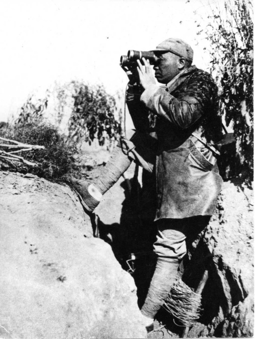 “誰敢橫刀立馬,唯我彭大將軍?!闭掌?,彭德懷大半個身體露在戰(zhàn)壕外,左腳踏在戰(zhàn)壕底,右腳蹬著戰(zhàn)壕前沿,坐靠在戰(zhàn)壕后沿上,手持望遠(yuǎn)鏡,神情專注地觀察戰(zhàn)況。